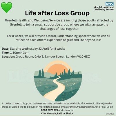Grenfell Health and Wellbeing Service are inviting those adults affected by Grenfell to join a small, supportive group where we will navigate the challenges of loss together
